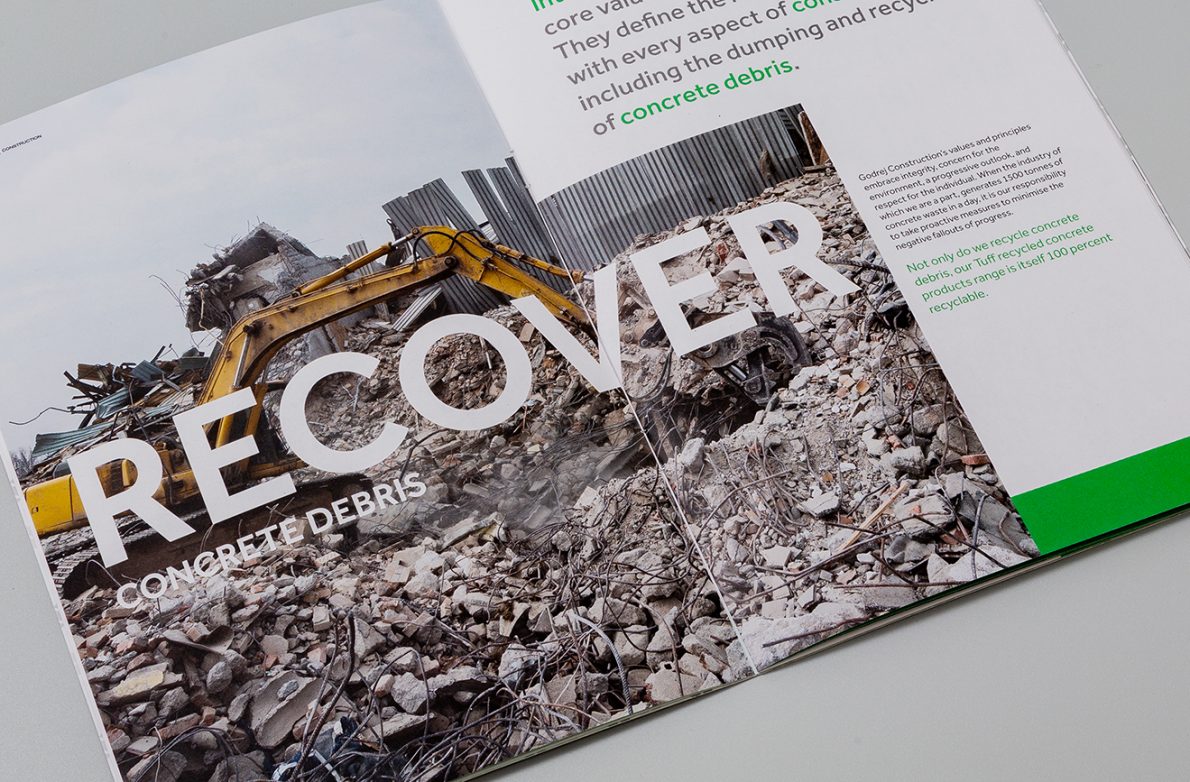 The whole process of recycling holds a powerful message in itself and creates a context for the communication. Recover-Recycle-Rebuild is our simple, but clear illustration of the process of recycling concrete to rebuild a greener future.